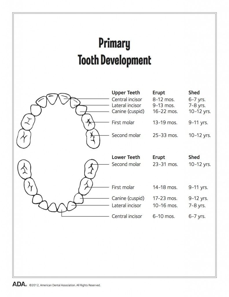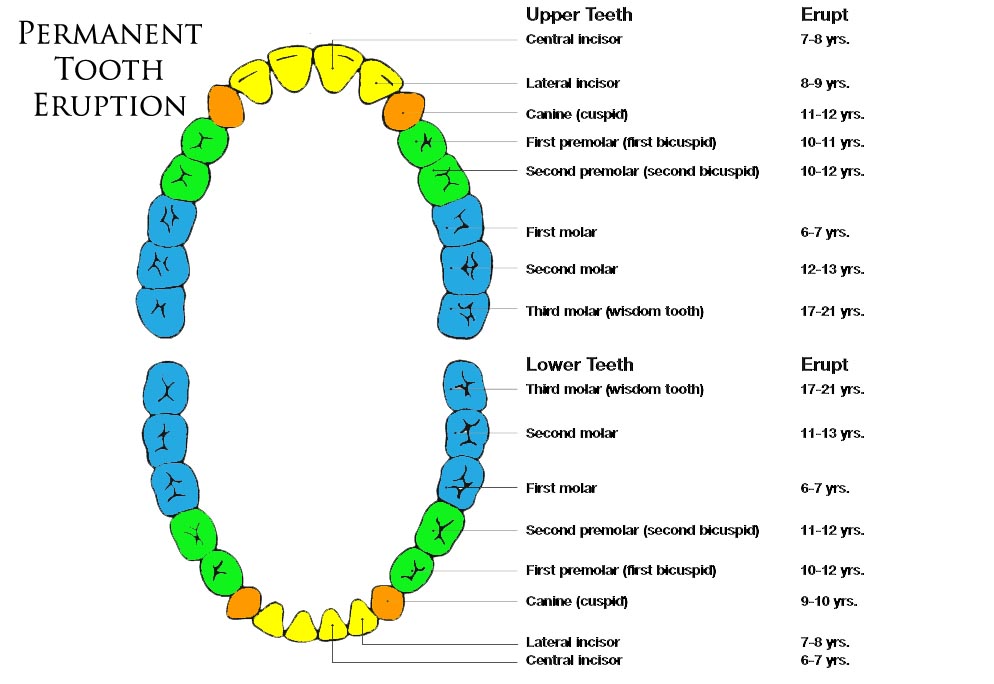 My child shed his milk teeth ages ago and there’s no sign of the permanent tooth? When this happens there are two possibilities: One is that the milk tooth was removed earlier than it should most likely by the dentist to create room for another growing tooth or because was very badly decayed. In this case if the permanent tooth was not quite ready to erupt it may take longer than usual to appear in the mouth. The other scenario is that there is some obstruction in the path of the permanent tooth preventing it from erupting fully. This is common particularly when baby molars are extracted too early and the neighbouring tooth drifts in to its space. It is important to have space maintenance treatment to prevent this. Below is a chart showing the eruption pattern of the permanent teeth: